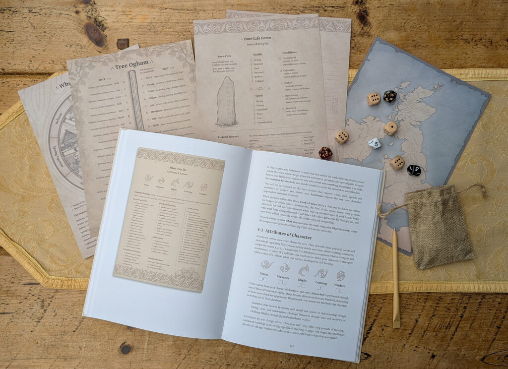 Rivers of Awen is a creative tool for open exploration through written and spoken words, supported by a 224-page illustrated guidebook, character sheets, dice and oracles.